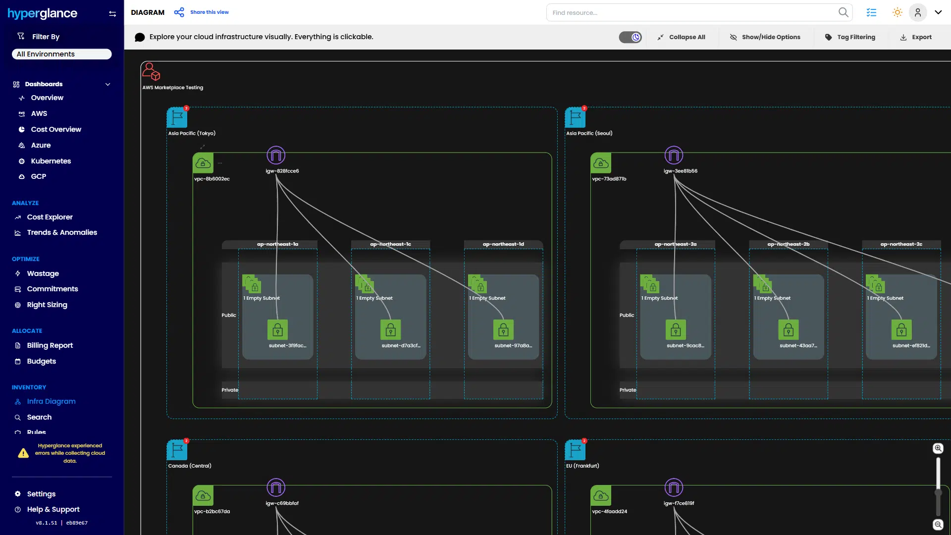 Hyperglance transforms raw billing data and cloud APIs into a single, actionable platform. It combines interactive diagrams, cost views, and rule-based checks into a single place.