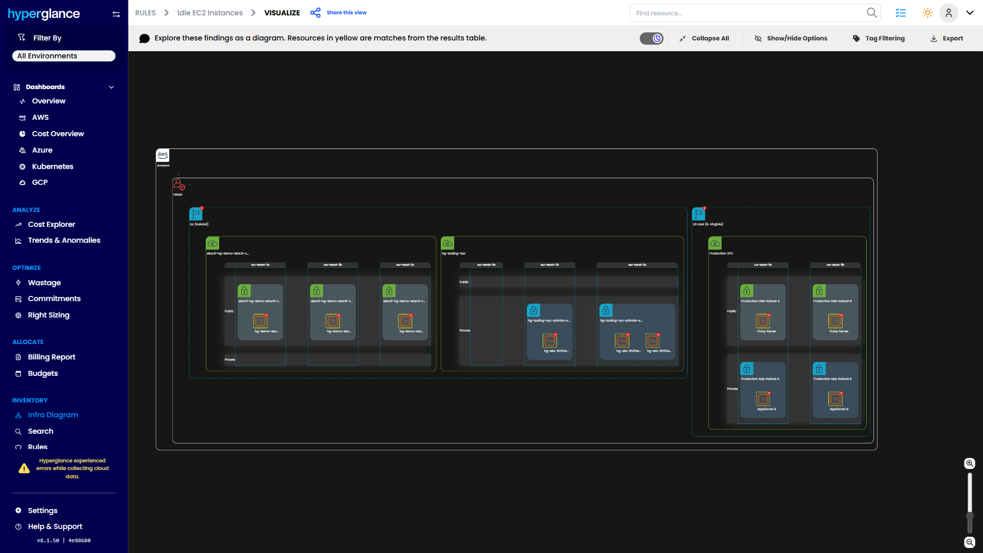 Hyperglance makes validation easier by showing relationships between instances, storage, networks, and applications in a single view. This answers the real FinOps question behind how to identify Idle EC2 Instances Safely: “Can I turn this off without consequences?”