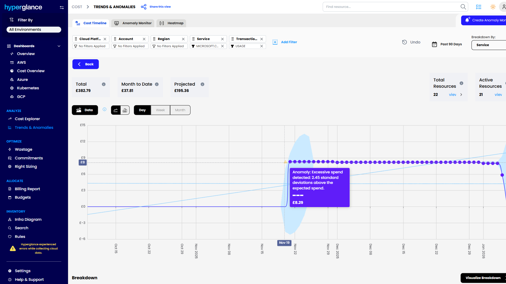 - Cost Management: Managing costs in the cloud can be a daunting task for businesses. However, with Hyperglance's "Trends and Anomalies" feature, businesses can gain clear visibility into their spending patterns, predict and curb unnecessary costs, and minimize unexpected costs that impact budgets and business operations.