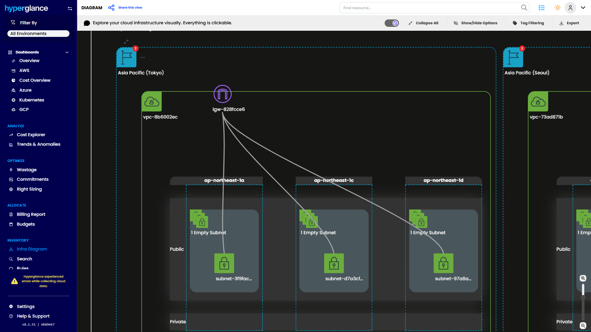 Hyperglance connects to the AWS, Azure, GCP & K8s APIs in parallel, giving you 1 view of your cloud inventory.