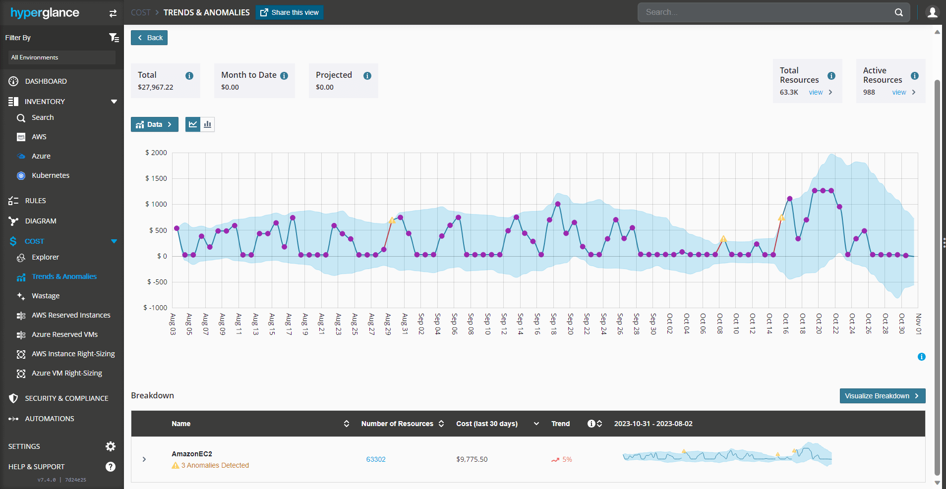 Stay ahead of unexpected surges with Anomaly Detection. Hyperglance flags cost irregularities early, helping you address issues before they escalate.